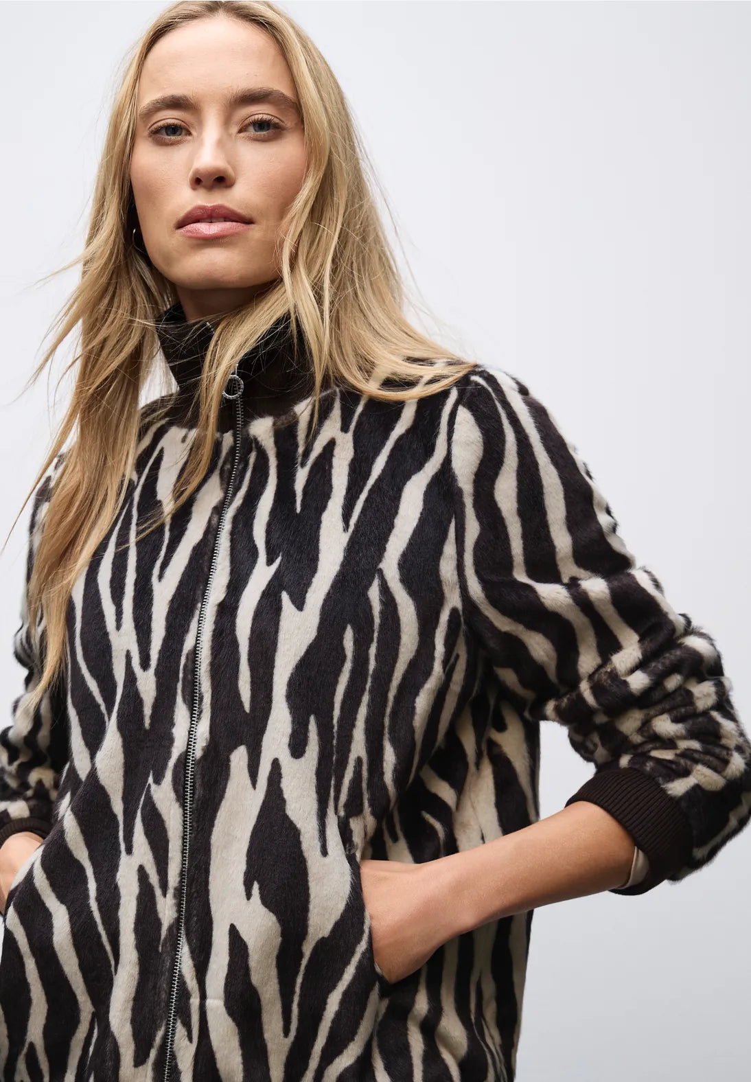 Con la chaqueta de piel sintética para mujer, haces una verdadera declaración. La suave calidad de la piel sintética en el moderno estampado de cebra crea un aspecto llamativo, mientras que el cuello alto, el cordón y los bolsillos laterales completan el diseño de forma funcional. Perfecto para conjuntos de moda con un factor de bienestar.