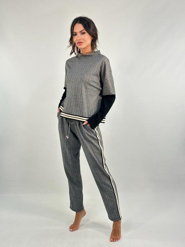 Pantalón de punto fino casual, cintura engomada y pinzas delanteras . Los bolsillos y la cinta decorativa lateral le dan ese punto chic urbano. Combínalo a conjunto con su jersey kimono para obtener un total look brutal.